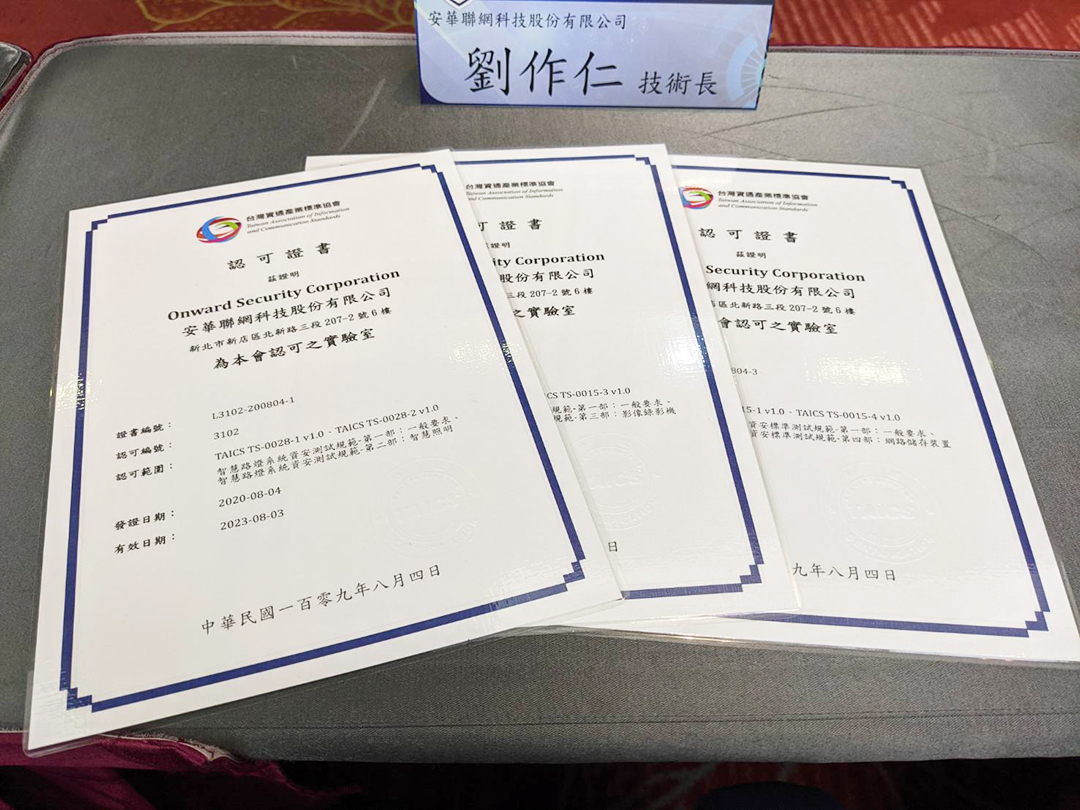「安華聯網科技股份有限公司」本年度獲證-增項認可實驗室,增項包括: 智慧路燈、影像監控系統-影像錄影機、影像監控系統-網路儲存裝置。